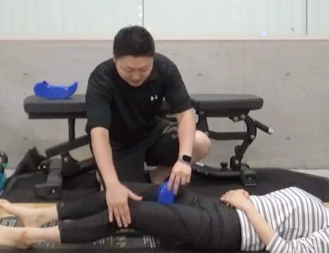 仰向けに寝てももの内側真ん中辺りにシェイパーをセットし、