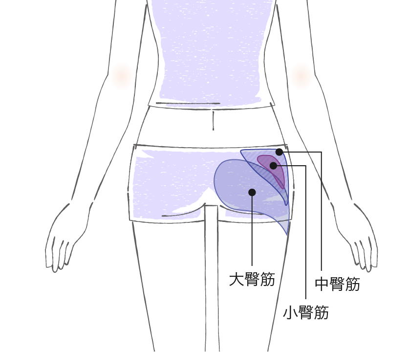 お尻の筋肉は大臀筋、中臀筋、小臀筋という臀筋群と言われるものと、深層にある所謂インナーマッスルにより構成されます。それぞれ役割があり、お互いが相互に作用する事でお尻の筋肉を使う事ができます。